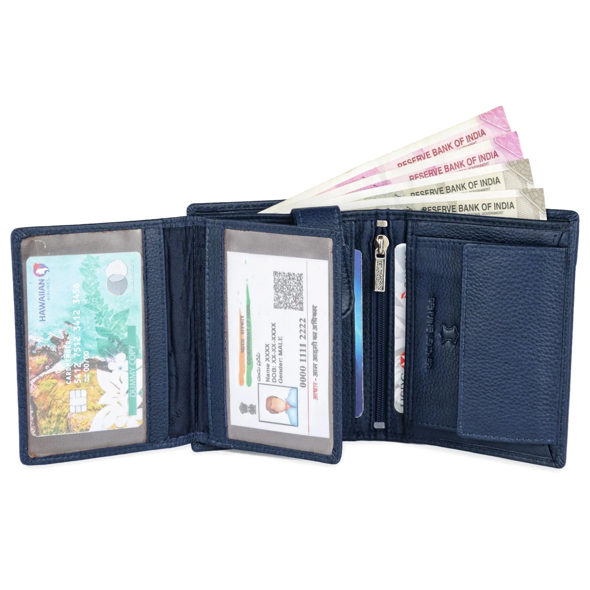 - Capacity : 1 external see-through ID , 1 Slip pocket , 9 Credit/debit card slots, 2 Cash/Coin Compartments. The wallet cum card holder zip closure for added security.